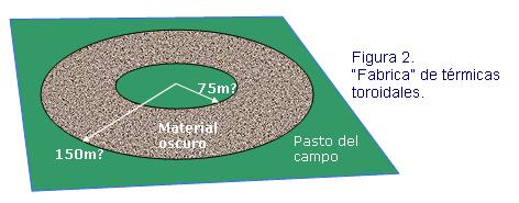 Bastaría entonces con cubrir el pasto con un circulo (cuanto más grande mejor) de algún material oscuro (p. ej. material de construcción, carbón, etc.; también, por otro lado habría evitar que crezca el pasto en esa zona, detalle que no tengo del todo claro como resolver). Este material oscuro absorbería la radiación solar, transmitiendo luego esta energía al aire con quien se encuentra en contacto. Ya todos conocemos el resto de la historia… Ahora, con todo esto formamos una burbuja térmica de algunos (dependiendo del radio de circulo construido) metros de diámetro.